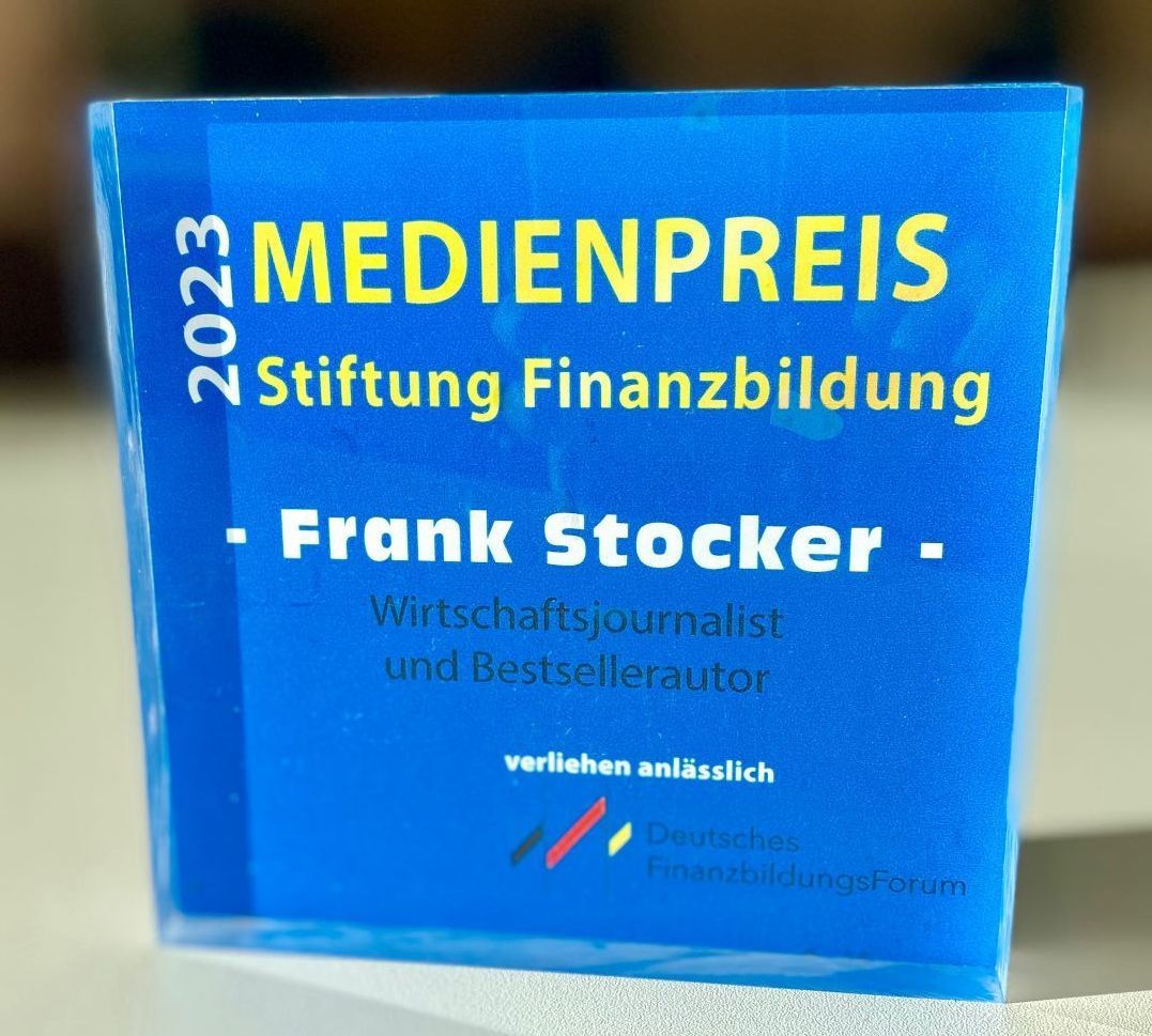 "Aus voller Überzeugung und mit Hochachtung für seine wertvolle Arbeit in Sachen Finanzverständnis und Vermittlung von ökonomischen Themen verleiht heute (am 25.10.2023) im Rahmen des "Deutschen FinanzbildungsForums" die STIFTUNG FINANZBILDUNG dem Journalisten und Bestsellerautor Frank Stocker den MEDIENPREIS 2023 der Stiftung Finanzbildung."