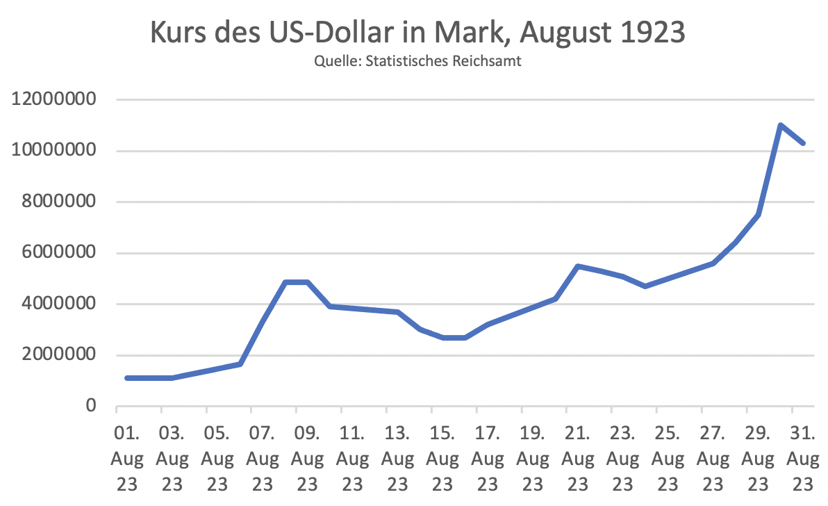 Noch schneller schritt die Abwertung im August voran, bis auf 10,3 Mio. Mark je Dollar. Das Kursminus in einem Monat: 89,3 Prozent.